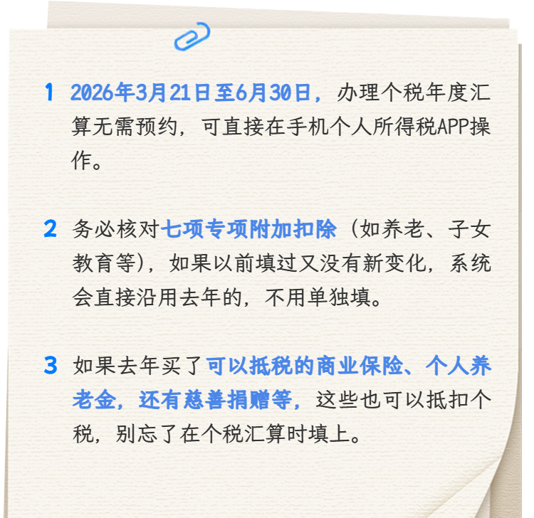 2026年3月21日起,2025年度个税汇算无需预约,可随时办理。那么应该如何办理?专项附加扣除齐有哪些?办理时有哪些常见问题?搞懂这些填报要点,帮你精真金不怕火完成个税汇算。